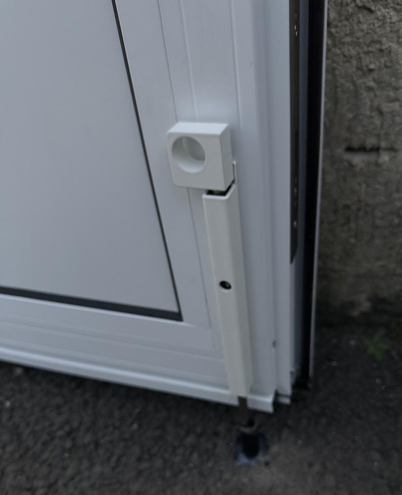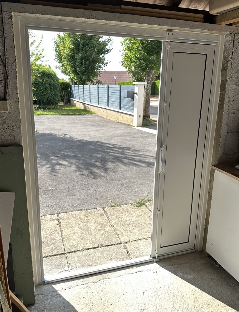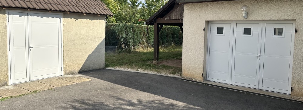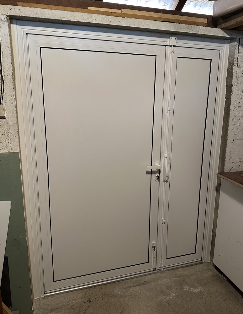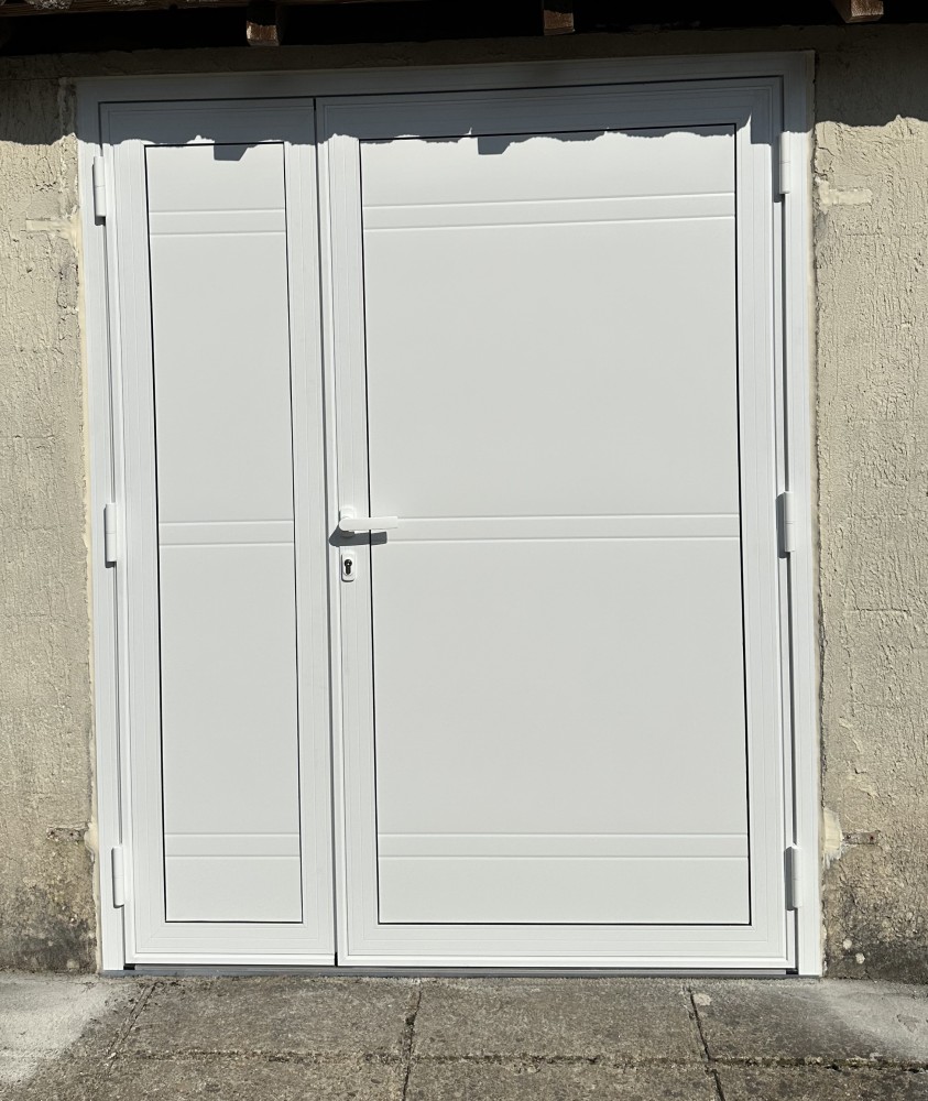 Porte de garage 2 vantaux sans rupture de pont thermique, tôle alu double nervure, coloris blanc, ouverture vers l'extérieure, seuil alu de 20 mm, béquille blanche, crémone pompier. Vantaux inégaux avec vantail de service 1000 mm, serrure 3 points à crochet