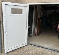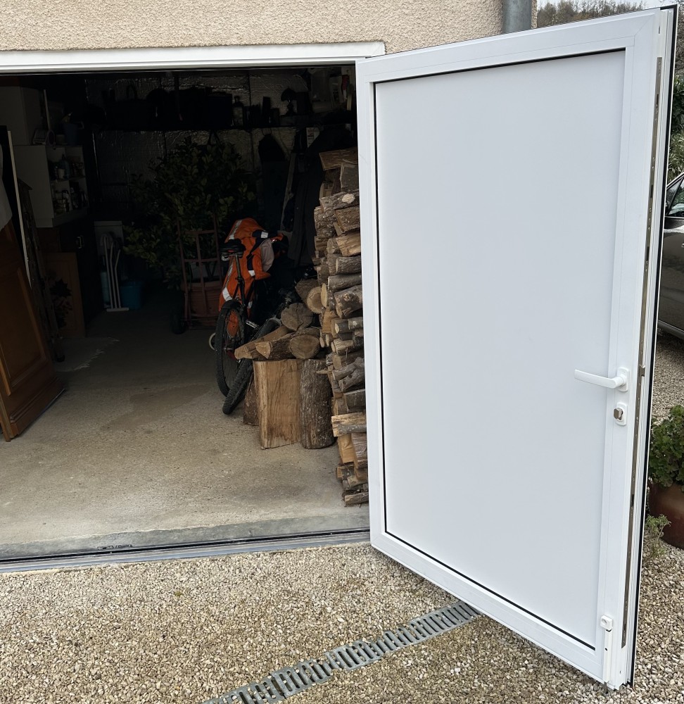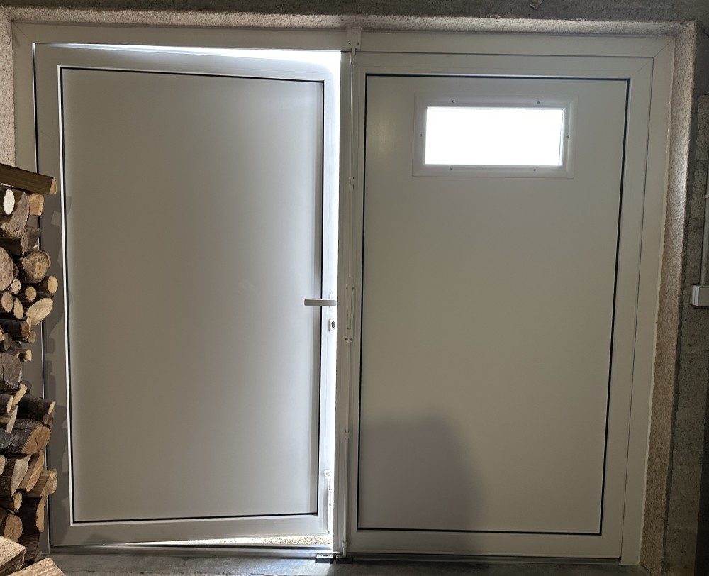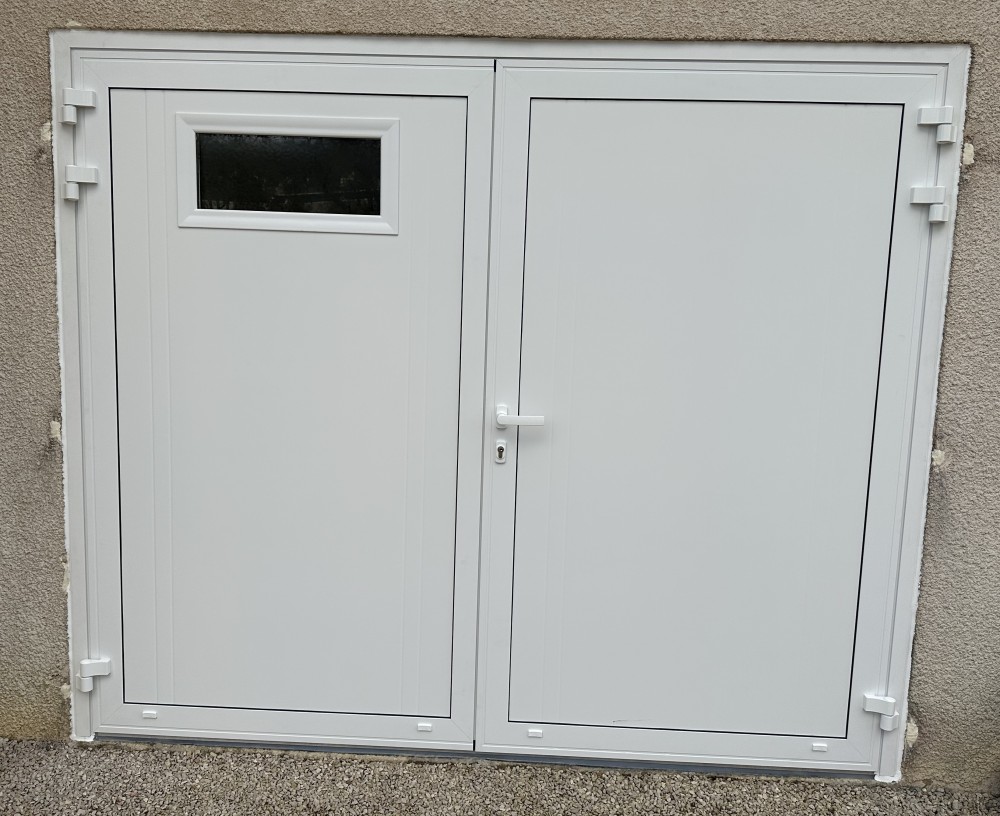 Porte alu double nervures verticales, à rupture de pont thermique, coloris blanc, ouverture extérieure, serrure à crochet à relevage de béquille. Articulation des vantaux sur paumelles réglables.